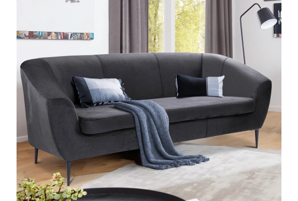 Elegantná trojmiestna pohovka na čiernych kovových nohách pôsobí vzdušne a hodí sa takmer do každého interiéru. Táto pohodlne polstrovaná pohovka má ergonomicky zaoblené bočné podrúčky a je čalúnená atraktívnou zamatovou látkou v tmavo šedom odtieni, ktorá je hladká na dotyk, príjemne mäkká a zároveň odolná, navyše jej lesklý efekt dodáva luxusný pocit.