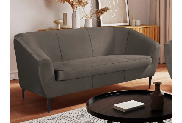 Elegantná trojmiestna pohovka na čiernych kovových nohách pôsobí vzdušne a hodí sa takmer do akéhokoľvek interiéru. Táto pohodlne polstrovaná pohovka má ergonomický zaoblené bočné podrúčky a je očalúnená atraktívnou zamatovou látkou v odtieni blatistá hnedá, ktorá je na dotyk hladká, príjemne hebká a zároveň odolná, navyše vďaka lesklému efektu pôsobí luxusným dojmom.