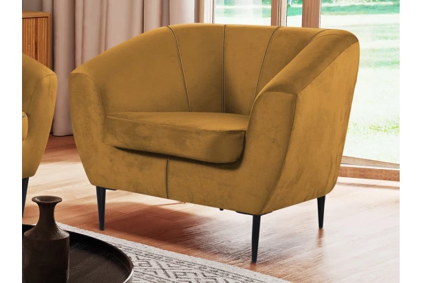 Elegantné kreslo na čiernych kovových nohách pôsobí vzdušne a pasuje takmer do akéhokoľvek interiéru. Toto pohodlne polstrované kreslo má ergonomicky zaoblené bočné podrúčky a je očalúnené atraktívnou zamatovou látkou v odtieni horčicovo žltá, ktorá je na dotyk hladká, príjemne hebká a zároveň odolná, navyše vďaka lesklému efektu pôsobí luxusným dojmom.