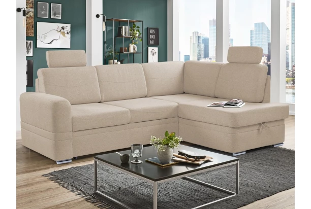 Rohová sedacia súprava s elegantným prešivom sa hodí svojimi rozmermi aj do malého priestoru. Očalúnená látkou vo farbe pieskovo béžová. Príjemné sedenie dopĺňajú dve opierky hlavy, ktoré je možné premiestniť na ľubovoľné miesto podľa aktuálnej potreby. Táto rohová sedačka spolu s otomanom tvorí pravý roh. Pod výklopným otomanom nájdete praktický úložný priestor. Rozkladaciu funkciu na príležitostné spanie ocení nielen Vaša návšteva.