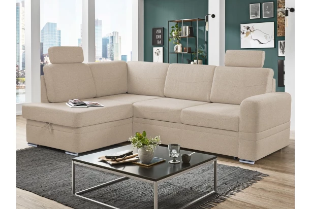 Rohová sedacia súprava s elegantným prešívaním sa svojimi rozmermi zmestí aj do malého priestoru. Očalúnená látkou v pieskovo-béžovej farbe. Pohodlné sedenie dopĺňajú dve opierky hlavy, ktoré sa dajú posunúť na ľubovoľné miesto podľa aktuálnej potreby. Táto rohová sedacia súprava spolu s otomanom tvorí ľavý roh. Pod otomanom nájdete praktický úložný priestor. Funkciu rozkladu na príležitostné spanie ocenia nielen Vaše návštevy.