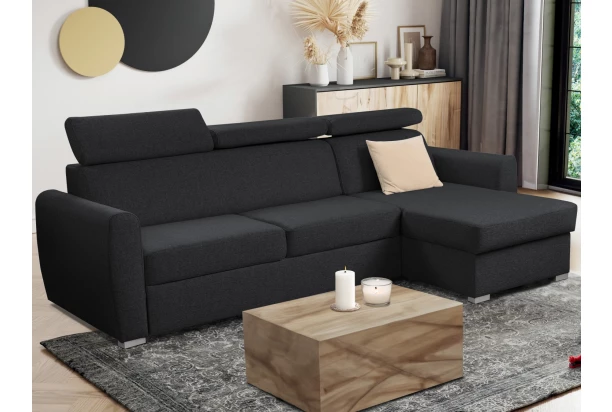 Pohodlná rohová sedacia súprava sa rozmerovo hodí aj do malého priestoru, kde ponúkne pohodlne mäkké sedenie s polohovateľnými opierkami hlavy. Sedačka je očalúnená odolnou látkou vo farbe čierna a je možné univerzálne zmontovať aké pravý alebo ľavý roh. Pod otomanom nájdete praktický úložný priestor. Funkciu rozkladu na príležitostné spanie využijete pri odpočinku alebo napríklad vaša víkendová návšteva.