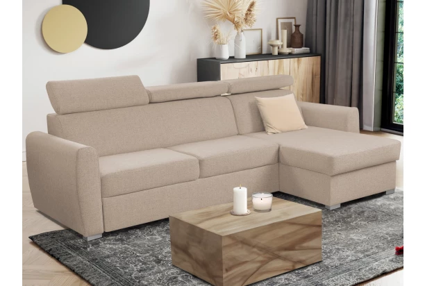 Pohodlná rohová sedacia súprava sa rozmerovo hodí aj do malého priestoru, kde ponúkne pohodlne mäkké sedenie s polohovateľnými opierkami hlavy. Sedačka je očalúnená odolnou látkou vo farbe svetlá hnedo-béžová a je možné ju univerzálne zmontovať ako pravý alebo ľavý roh. Pod otomanom nájdete praktický úložný priestor. Funkciu rozkladu na príležitostné spanie využijete pri odpočinku alebo napríklad Vaša víkendová návšteva.