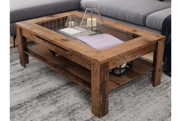 Priestranný konferenčný stolík o veľkosti 110×67 cm je navyše doplnený odkladacou priehradkou a úložnou zásuvkou. Vyrobený vo vintage optike drevených lát. Horná plocha stolíka je zaujímavo kombinovaná tvrdeným sklom, ktoré poskytuje priehľad do priestoru zásuvky. Máte tak vždy časopisy, noviny alebo veci dennej potreby prehľadne uložené na dosah ruky. Presklenú časť môžete prípadne využiť aj ako priestor na vystavenie fotiek alebo obľúbených dekorácií na zútulnenie atmosféry vášho domova.