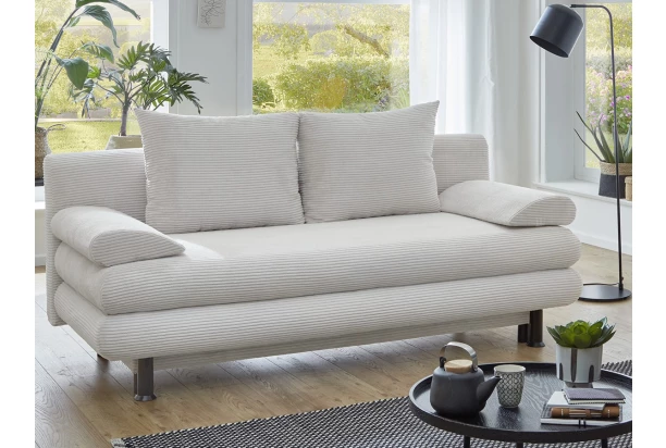Elegantná pohovka so zaoblenými tvarmi, opornými vankúšmi a rozkladacou funkciou na príležitostné spanie, ktorú využijete vy sami počas relaxácie alebo vaša návšteva. Pod sedákom môžete využiť aj úložný priestor na uschovanie dennej deky, lôžkovín alebo vecí sezónnej potreby. Pohovka je očalúnená mäkkou štruktúrovanou látkou vo farbe krémová.