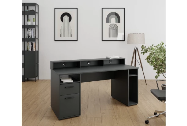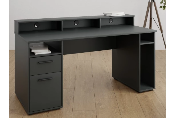 Písací stôl s praktickým nástavcom a priehradkami, v ktorých budete mať všetko po ruke. Antracitový stôl je vybavený bočnou zásuvkou, vnútorným úložným priestorom za otočnými dvierkami a ďalšími priehradkami na prehľadné ukladanie potrebných vecí na hranie hier i prácu na počítači.