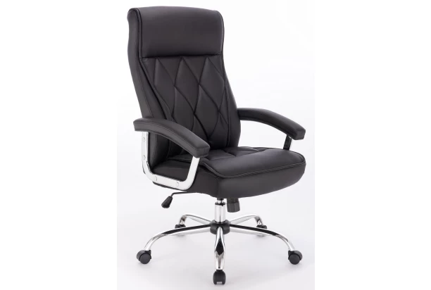 Priestranné kancelárske kreslo v kombinácii chrómovo lesklého kovu a čiernej ekokože dopĺňa kosoštvorcové prešitie. Táto kancelárska stolička s bočnými podrúčkami ponúka komfortne mäkké sedenie vďaka špeciálnemu jadru z taštičkových pružín. Kreslo je vhodné aj pre väčšie osoby.