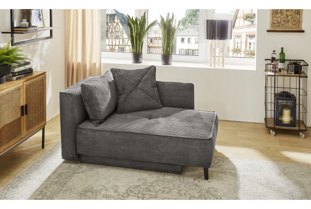 Táto malá pohovka vytvorí útulné miesto pre domácu pohodu v každom byte. Leňoška je očalúnená mäkučkuo štruktúrovanou látkou vo farbe tmavo šedá a doplnená opornými vankúšmi. Oceníte jej úložný priestor aj praktickú rozkladaciu funkciu na príležitostné spanie alebo relaxovanie. Jednoduchým vysunutím sedadla do bočnej strany vznikne behom chvíľky všestranne využiteľné lôžko. Pohovku je možné univerzálne zmontovať s bočnou podrúčkou umiestnenou na pravú alebo ľavú stranu podľa dispozície Vášho bytu.