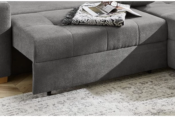 Rohová sedacia súprava s kvalitným vypolstrovaním má priestranné sedenie doplnené veľkými vankúšmi. Sedačka je očalúnená látkou vo farbe dymovo šedá a zvýraznená atraktívnym prešívaním. Stranu sedačky s otomanom je možné ľubovoľne umiestniť na pravú alebo ľavú stranu a vytvoriť tak pravý alebo ľavý roh podľa dispozície Vašej obývačky. Túto sedačku je možné aj rozložiť na lôžko na príležitostné spanie. V dolnej časti sedačky nájdete aj praktický úložný priestor, kam kedykoľvek uschováte napríklad lôžkoviny, veci sezónnej potreby alebo napríklad deky.