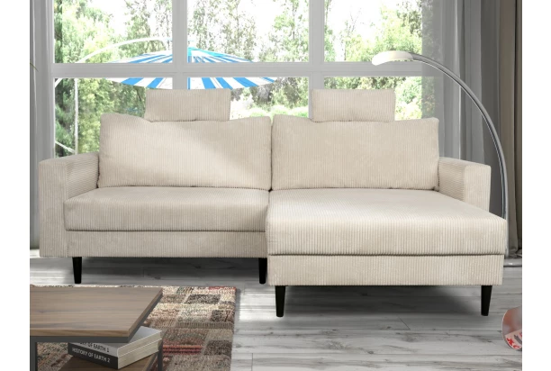 Trendová rohová sedacia súprava s veľkými vankúšmi a opierkami hlavy pre príjemné domáce pohodlie. Očalúnená mäkučkou štruktúrovanou látkou vo farbe krémová, ktorá je veľmi útulná. Táto sedačka ponúka možnosť univerzálneho zostavenia ako pravý alebo ľavý roh a navyše je vďaka svojim rozmerom vhodná taktiež do malého priestoru obývačky. Pri sedačke oceníte rozkladaciu funkciu na príležitostné lôžko aj úložný priestor ukrytý pod sedákom. Sedačka na vyšších nôžkach uľahčuje údržbu podlahy, kedy môžete využiť aj robotický vysávač.