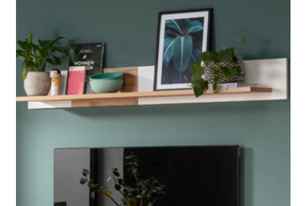Nástenná polica z programu Matera – moderný nábytok v kombinácii matne bielych povrchov s dubovým drevodekorom pre útulne zariadený domov. Polica je umiestnená na zadnom nástennom paneli.