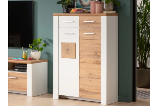 Vysoká skrinka so zásuvkami z programu Matera – moderný nábytok v kombinácii matne bielych povrchov s dubovým drevodekorom pre príjemný a útulne zariadený domov. Štýlová aplikácia s optikou popraskaného dreva vytvára skvelý kontrast a zaujme na pohľad. Skrinka so šírkou 80 cm obsahuje 2 zásuvky a 2 otočné dvere, za ktorými nájdete úložné priestory s policami.
