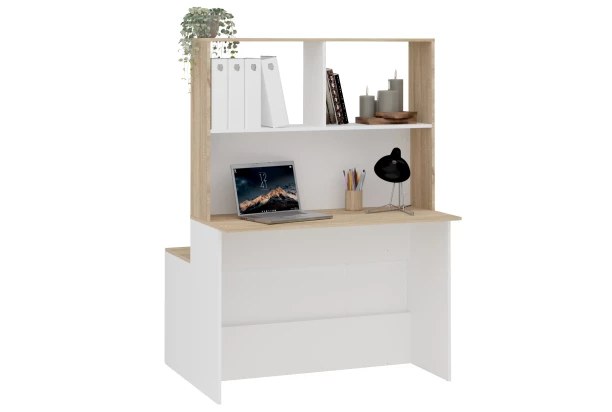 Obojstranná skrinka so písacím stolom je skvelým a praktickým riešením do všetkých bytov. Konštrukciu je možné umiestniť do priestoru alebo bočnou stranou k stene a vytvoriť tak prirodzený a funkčný predel miestnosti. Z jednej strany písací stôl s regálom vytvorí pokojné zázemie pre domáce práce a z druhej strany úložná skrinka na univerzálne ukladanie vecí, prípadne aj vystavenie dekorácií. Tento praktický nábytok môže byť umiestnený nielen v pracovni, detskej izbe a spálni, ale aj v obývacej izbe, kde poskytne multifunkčné zázemie pre prácu na počítači, vaše domáce hobby aj odkladanie predmetov. Ďalším využití môže nájsť aj ako barový pult medzi kuchyňou a obývačkou. Nábytok môže tvoriť spoločný kompaktný celok alebo byť rozmiestnený samostatne ako písací stôl s regálom a samostatná skrinka. Nech už túto zostavu nábytku využijete akokoľvek, tak vždy bude praktickou súčasťou vášho bytu. Písací stôl aj skrinka sú vyrobené v kombinácii biela/dub sonoma.