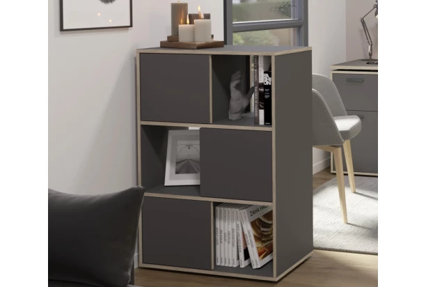 Priestorový regál v antracitovej farbe dopĺňajú kontrastné bočné lemy v dubovom dekore, ktoré vytvárajú zaujímavú optiku. Regál s otvorenými priehradkami a úložným priestorom za otočnými dverami ľahko umiestnite bočnou stranou k stene alebo ľubovoľne do priestoru.