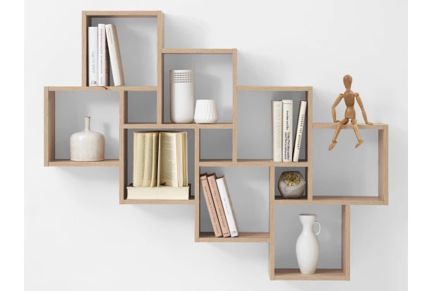 Nástenný regál v dekore dub sonoma má zaujímavo členitú konštrukciu, ktorá obsahuje celkom 11 priehradiek o dvoch rôznych veľkostiach. Tento praktický regál prakticky poslúži na knižky, dekorácie alebo akékoľvek drobné predmety.