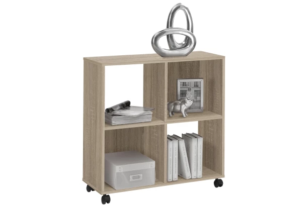 Jednoducho praktický regál na kolieskach je vyrobený v dekore dub sonoma a ponúka štyri priehradky na univerzálne ukladanie vecí. Do priehradok môžete navyše ľubovoľne vložiť napríklad látkové úložné boxy.
