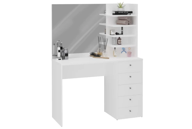 Moderný kozmetický stolík so zrkadlom pre skutočné parádnice, ktoré budú mať vďaka praktickým odkladacím poličkám vždy všetko po ruke. Biely toaletný stolík so zrkadlom sa hodí do každej spálne alebo šatne. Na uschovanie ďalšej kozmetiky alebo doplnkov poslúži päť bočných zásuviek. Vďaka kompaktným rozmerom nájde tento stolík svoje miesto aj v malom priestore.