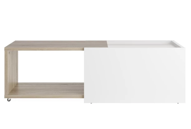 Nápaditý konferenčný stolík s výsuvnou konštrukciou si ľahko prispôsobíte podľa potreby. Stolík je zložený z dvoch do seba zapadajúcich častí a vďaka konštrukcii na kolieskach úložnú časť stolíka jednoducho vysuniete a tým si prispôsobíte veľkosť stolíka podľa aktuálnej potreby. Stolík potom jednoducho zasuniete a do jeho vnútornej časti uschováte napríklad časopisy alebo veci každodennej potreby. Stolík je vyrobený v kombinácii biela/dub sonoma.