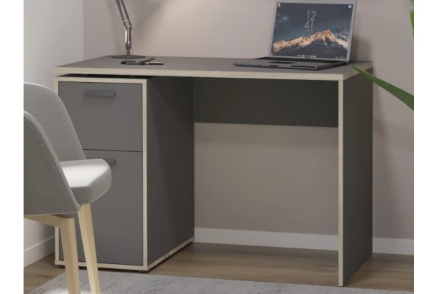 Písací stôl v antracitovej farbe dopĺňajú kontrastné bočné lemy v dubovom dekore, ktoré vytvárajú zaujímavú optiku. Písací stôl obsahuje zásuvku aj úložný priestor za otočnými dverami. Tento stôl je možné univerzálne zmontovať s úložnými priestormi na pravej alebo ľavej strane – ľahko sa tak prispôsobí Vašej potrebe.