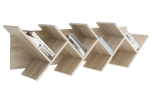 Moderný nástenný regál v dekore dub sonoma má zaujímavý design priehradok. Tento regál využijete nielen na odkladanie knižiek alebo časopisov – súčasťou regálu sú navyše aj závesné háčiky, ktoré môžete využiť na zavesenie tašiek alebo oblečenia. Regál môže byť zmontovaný so závesnými háčikmi aj bez nich.