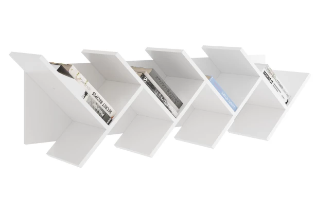 Moderný nástenný regál v bielej farbe má zaujímavý design priehradok. Tento regál využijete nielen na odkladanie knižiek alebo časopisov – súčasťou regálu sú navyše aj závesné háčiky, ktoré môžete využiť na zavesenie tašiek alebo oblečenia. Regál môže byť zmontovaný so závesnými háčikmi aj bez nich.
