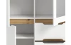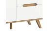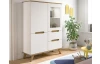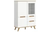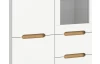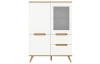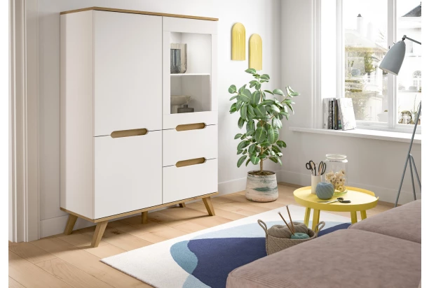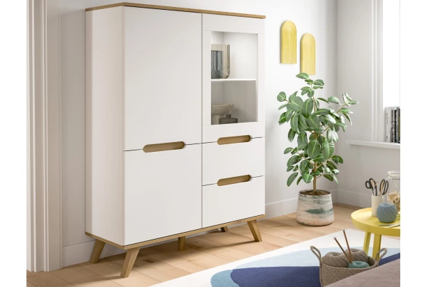 Skrinka s presklením z kolekcie Scandi – nábytok v obľúbenom škandinávskom štýle má čistý elegantný dizajn, kónickú podnož a moderné bezúchytové prevedenie so zaoblením predných plôch. Kombinácia bielej farby s drevodekorom dub nox pôsobí útulne a pasuje do mnohých interiérov. Táto skrinka s presklením o šírke 100 cm a výške 140 cm ponúka praktickú kombináciu dverí a zásuviek – prehľadne si tak môžete uložiť písacie potreby, veci každodennej potreby, deky aj oblečenie. Do presklenej vitríny si môžete vystaviť obľúbené dekorácie, fotky alebo poháre. Oceníte kvalitné spracovanie aj ľahko udržiavateľné povrchy. Táto skrinka s presklenou vitrážou bude skvele vyzerať nielen v obývačke alebo jedálni, ale aj napríklad v domácej pracovni, kde vytvorí útulný scandi look a zároveň prakticky poslúži každý deň.