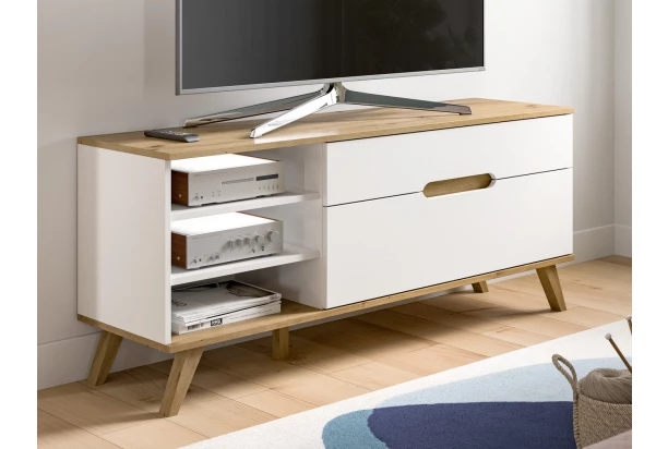 Televízna skrinka z kolekcie Scandi – nábytok v obľúbenom škandinávskom štýle má čistý elegantný dizajn, kónickú podnož a moderné bezúchytové prevedenie so zaoblením predných plôch. Kombinácia bielej farby s drevodekorom dub nox pôsobí útulne a pasuje do mnohých interiérov. Táto TV skrinka so šírkou 140 cm ponúka praktickú kombináciu otvorených priehradiek, zásuvku aj úložný priestor za výklopnými dvierkami – prehľadne tak rozmiestnite elektroniku aj veci každodennej potreby. Oceníte kvalitné spracovanie aj ľahko udržiavateľné povrchy. Televízny stolík so zásuvkou tak bude skvele vyzerať v priestore obývačky, kde vytvorí útulný scandi look a zároveň prakticky poslúži každý deň.