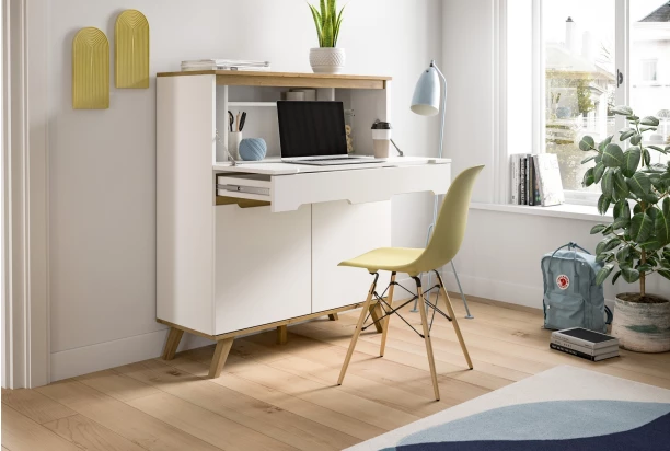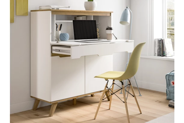 Sekretár s výklopným stolíkom z kolekcie Scandi – nábytok v obľúbenom škandinávskom štýle má čistý elegantný dizajn, kónickú podnož a moderné bezúchytové prevedenie so zaobleným predných plôch. Kombinácia bielej farby s drevodekorom dub nox pôsobí útulne a hodí sa do mnohých interiérov. Tento sekretár so šírkou 100 cm ponúka dvojitú zásuvku, úložné priestory za dvierkami a výklopný stolík, za ktorým nájdete praktické priehradky – prehľadne si tak môžete uložiť písacie potreby, dokumenty aj veci každodennej potreby. Oceníte kvalitné spracovanie aj ľahko udržiavateľné povrchy. Multifunkčná skrinka bude skvele vyzerať nielen v obývačke alebo jedálni, ale aj v domácej pracovni, kde vytvorí útulný scandi look a zároveň prakticky poslúži každý deň.