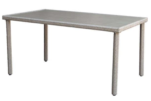 Obdĺžnikový záhradný stôl o veľkosti 150×90 cm z radu Alford – záhradný nábytok z obľúbenej kombinácie kovu, imitácie ratanu a drevených dosiek sa hodí takmer na akúkoľvek záhradu, terasu, balkón či dvor. Odolná imitácia ratanu a drevených dosiek v béžovom prevedení pôsobí veľmi elegantne – nábytok tak môžete využiť ako vonku na záhrade, tak aj vo vnútri bytu, napríklad aj v priestore zimnej záhrady.