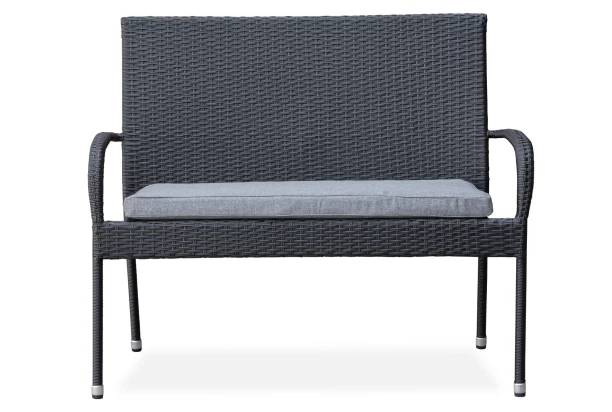 Záhradná lavica s podsedákom z radu Alford – záhradný nábytok z obľúbenej kombinácie kovu a imitácie ratanu sa hodí takmer na akúkoľvek záhradu, terasu, balkón či dvor. Odolná imitácia ratanu v čiernom prevedení pôsobí veľmi elegantne – nábytok tak môžete využiť ako vonku na záhrade, tak aj vo vnútri bytu, napríklad aj v priestore zimnej záhrady.