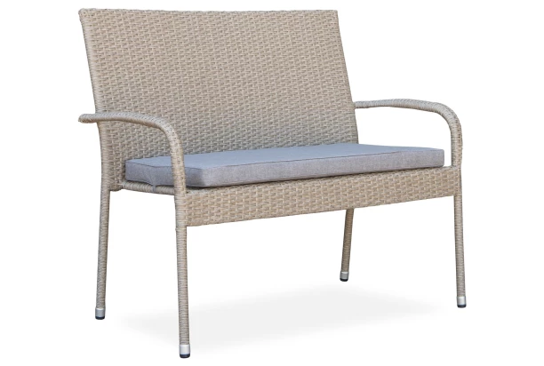 Záhradná lavica s podsedákom z radu Alford – záhradný nábytok z obľúbenej kombinácie kovu a imitácie ratanu sa hodí takmer na akúkoľvek záhradu, terasu, balkón či dvor. Odolná imitácia ratanu v béžovom prevedení pôsobí veľmi elegantne – nábytok tak môžete využiť ako vonku na záhrade, tak aj vo vnútri bytu, napríklad aj v priestore zimnej záhrady.
