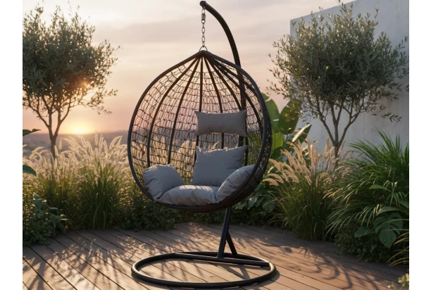 Závesné kreslo z kovu a prepletenej imitácie čierneho ratanu je obľúbeným doplnkom na záhrade domu alebo kdekoľvek na vonkajšej terase. Kreslo obsahuje mäkký členitý vankúš a podhlavník na vytvorenie pohodovej atmosféry počas posedenia alebo pohodového hojdania v prírode. Toto kreslo môžete umiestniť napríklad aj do interiéru zimnej záhrady.