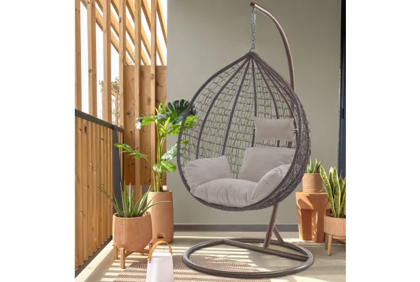 Závesné kreslo z kovu a prepletenej imitácie hnedého ratanu je obľúbeným doplnkom na záhrade domu alebo kdekoľvek na vonkajšej terase. Kreslo obsahuje mäkký členitý vankúš a podhlavník na vytvorenie pohodovej atmosféry počas posedenia alebo pohodového hojdania v prírode. Toto kreslo môžete umiestniť napríklad aj do interiéru zimnej záhrady.
