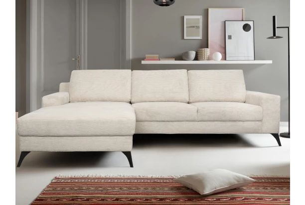 Elegantná rohová sedacia súprava ponúka príjemný komfort sedenia a výborne sa hodí do moderne zariadeného interiéru. Sedačka pôsobí v priestore obývačky navyše veľmi útulne vďaka poťahu z mäkkučkej štruktúrovanej látky vo farbe béžová. Čierne kovové nohy dodávajú sedačke stabilitu a zároveň umožňujú jednoduchú údržbu podlahovej plochy. Otoman sedačky je možné univerzálne namontovať na obe strany a vytvoriť si tak tým pádom pravý alebo ľavý roh – podľa vašich priestorových možností.