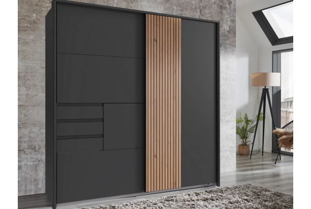 Šatníková skriňa so šírkou 180 cm má moderný dizajn a je vyrobená v prevedení tmavo šedý grafit. Predné plochy navyše dopĺňa zaujímavý lamelový efekt v drevodekore dub artisan, vďaka ktorému skriňa zaujme na pohľad. Za posuvnými dverami nájdete dostatok políc aj závesnú šatníkovú tyč. Táto skriňa navyše obsahuje tri zásuvky, ktoré sú zaujímavo zabudované medzi posuvné dvere.