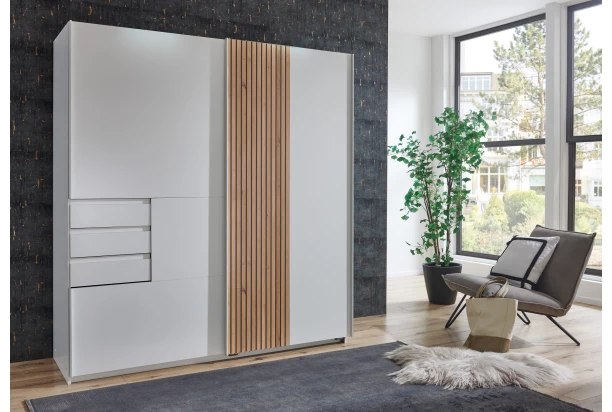 Šatníková skriňa so šírkou 180 cm má moderný dizajn a je vyrobená v prevedení biela. Predné plochy navyše dopĺňa zaujímavý lamelový efekt v drevodekore dub artisan, vďaka ktorému skriňa zaujme na pohľad. Za posuvnými dverami nájdete dostatok políc aj závesnú šatníkovú tyč. Táto skriňa navyše obsahuje tri zásuvky, ktoré sú zaujímavo zabudované medzi posuvné dvere.