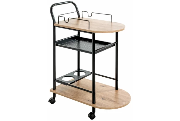 Servírovací stolík na kolieskach v modernej kombinácii čierneho kovu a drevodekoru dub poslúži v kuchyni, jedálni alebo napríklad v obývačke. Vďaka kolieskam je možné ho ľahko premiestniť. Vďaka poličkám aj priehradkám na fľašky je možné využiť aj ako barový stolík.