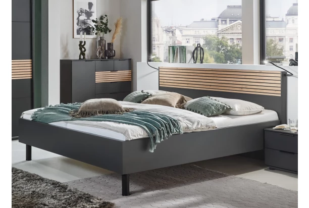 Komoda so zásuvkami zo spálňovej kolekcie Rotterdam – nábytok v tmavosivom grafitovom prevedení vytvorí v interiéri spálne intímnu atmosféru pre pokojný spánok. Predné plochy navyše dopĺňa zaujímavý lamelový efekt v drevodekore dub artisan, vďaka ktorému nábytok zaujme na pohľad a zároveň zútulní prostredie.