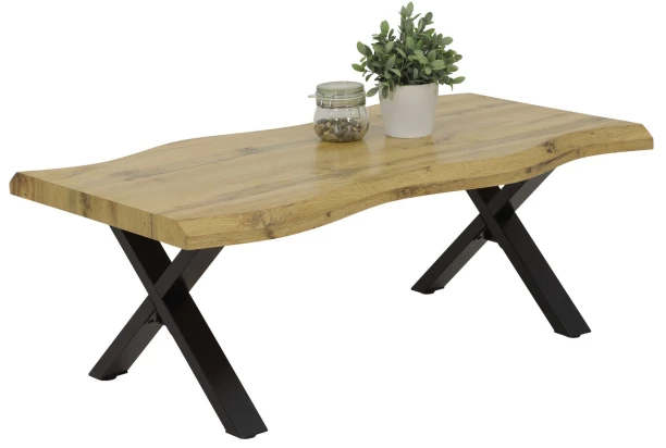 Priestranný konferenčný stolík s veľkosťou 110×60 cm zaujme optikou masívneho dreva s opracovanými hranami do zaoblených tvarov – horná doska tak pôsobí ako kus masívneho dreva. Vyrobený v drevodekore divoký dub v kombinácii s čiernou kovovou podnožou v tvare X.