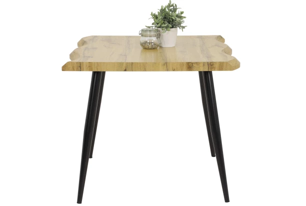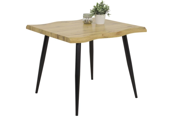 Štvorcový jedálenský stôl o veľkosti 90×90 cm v modernom dizajne zaujme optikou masívneho dreva s opracovanými hranami do zaoblených tvarov. Vyrobený v drevodekore divoký dub v kombinácii v čiernym kovom. Čierne kovové nohy dodávajú stolu potrebnú stabilitu.