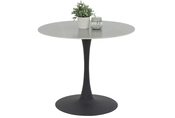 Okrúhly jedálenský stôl s priemerom 90 cm je vyrobený v imitácii šedého mramoru. Moderný dizajn stola podčiarkuje stredová kovová podnož v tmavom antracitovom prevedení, ktorá stolu dodáva stabilitu. Tento okrúhly stôl nájde svoje miesto aj v malom priestore modernej jedálne alebo kuchyne.
