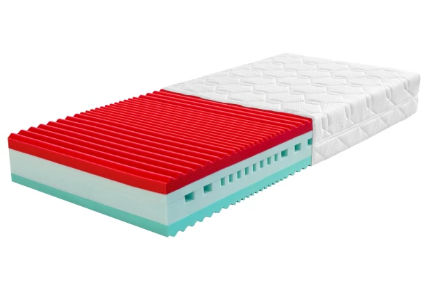 - červená strana: tuhšia strana, studená pena HR 5030, štruktúrovaný povrch, 5-zónová štruktúra, kvalitná podpora a odolnosť, stupeň tuhosti: 3 (stupnica tuhosti: 1 mäkká – 5 tuhá)