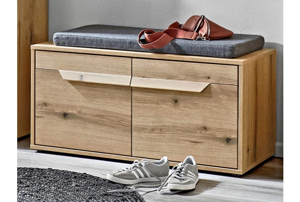 Predsieňová lavica na topánky z kolekcie Perado – nábytok v útulnom drevodekore dub evoke dodáva predsieni alebo vstupnému priestoru prirodzene pôsobiaci elegantný vzhľad, ktorý sa hodí do rôznych štýlovo zariadených interiérov. Nábytok zároveň vytvára príjemne hrejivú domácku atmosféru. Lavica poskytuje pohodlné sedenie pri obúvaní a vyzúvaní alebo čakaní na ostatných členov domácnosti a zároveň poskytuje ďalší úložný priestor pre topánky či iné predmety. Vysoko kvalitné materiály a starostlivé spracovanie zaisťujú odolnosť a stabilitu, povrchy sa ľahko udržujú a dajú sa ľahko čistiť ľahko navlhčenou handričkou. Tento nábytok je praktický a zároveň vytvára elegantný a nadčasový vzhľad v miestnosti.