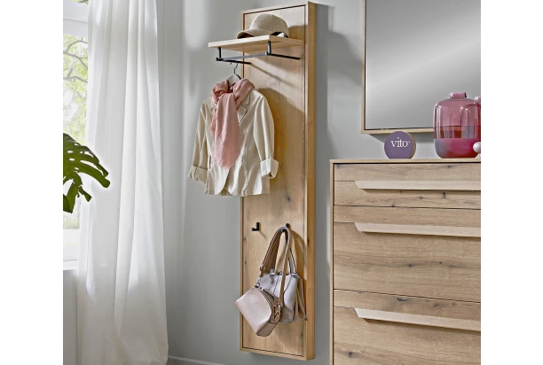 Nástenný šatníkový panel s výškou 180 cm z kolekcie Perado – nábytok v útulnom drevodekore dub evoke dodáva predsieni alebo vstupnému priestoru prirodzene pôsobiaci elegantný vzhľad, ktorý sa hodí do rôznych štýlovo zariadených interiérov. Nábytok zároveň vytvára príjemne hrejivú domácku atmosféru. Šatníkový panel s tyčou, závesnými háčikmi a policou ponúka praktické zavesenie búnd, kabátov, šatiek a ďalších doplnkov. Vysoko kvalitné materiály a starostlivé spracovanie zaisťujú odolnosť a stabilitu, povrchy sa ľahko udržujú a dajú sa ľahko čistiť ľahko navlhčenou handričkou. Tento nábytok je praktický a zároveň vytvára elegantný a nadčasový vzhľad v miestnosti.