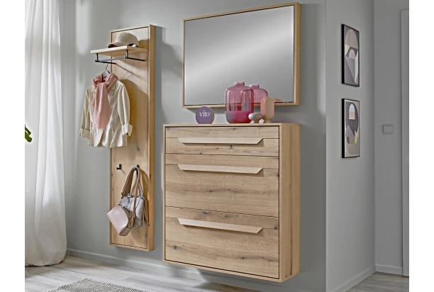 Predsieňová zostava z kolekcie Perado (3-dielna) – nábytok v útulnom drevodekore dub evoke dodáva predsieni alebo vstupnému priestoru prirodzene pôsobiaci elegantný vzhľad, ktorý sa hodí do rôznych štýlovo zariadených interiérov. Nábytok zároveň vytvára príjemne hrejivú domácku atmosféru. Táto predsieňová stena obsahuje 3 diely: nástenný šatníkový panel, nástenné zrkadlo a praktický botník so zásuvkou, ktorý môže byť univerzálne zavesený na stenu alebo klasicky stáť na podlahe. Vysoko kvalitné materiály a starostlivé spracovanie zaisťujú odolnosť a stabilitu, povrchy sa ľahko udržujú a dajú sa ľahko čistiť ľahko navlhčenou handričkou. Tento nábytok je praktický a zároveň vytvára elegantný a nadčasový vzhľad v miestnosti.