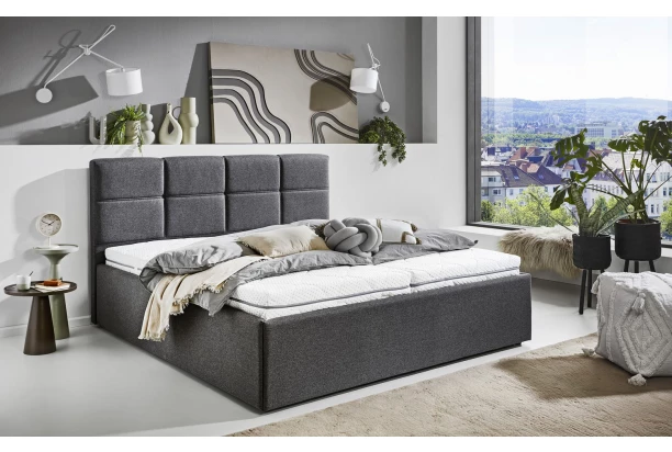 Moderná dvojlôžková posteľ o veľkosti 180×200 cm sa hodí do každej moderne zariadenej spálne. Posteľ je čalúnená sivou látkou a čelo má ozdobný dvojitý šev. Pri kombinácii s výklopným roštom je možné dolný priestor pod lôžkom využiť aj na praktické ukladanie najrôznejších vecí. Táto posteľ má zároveň aj kompaktné rozmery konštrukcie a tým pádom zbytočne nezaberá príliš miesta v priestore spálne.