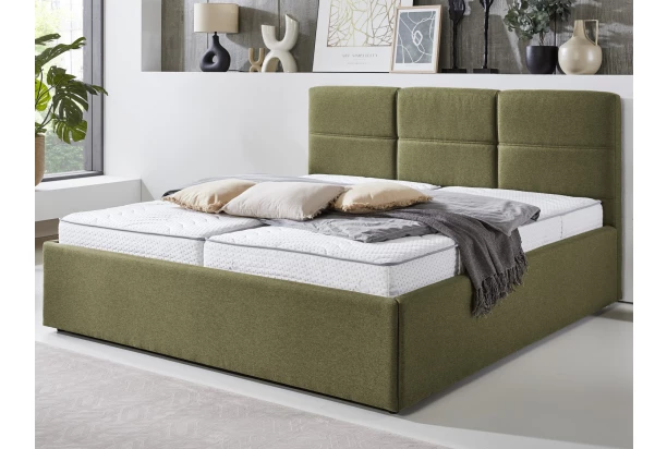 Trendová dvojlôžková posteľ o veľkosti 180×200 cm sa hodí do každej moderne zariadenej spálne. Posteľ je očalúnená látkou vo farbe olivovo zelená a chrbtové čelo má doplnené okrasným dvojitým prešivom. Pri kombinácii s výklopným roštom je možné dolný priestor pod lôžkom využiť aj na praktické ukladanie rôznych vecí. Táto posteľ má tiež kompaktné rozmery konštrukcie a preto nezaberie zbytočne príliš miesta v priestore spálne – je teda dobrou voľbou aj do menšieho priestoru.