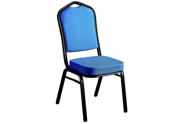 Klasická jedálenská stolička z čierneho kovu má zaoblené tvary a horné kovové madlo pre ľahkú manipuláciu. Sedacia a oporná časť je očalúnená látkou vo farbe modrá.