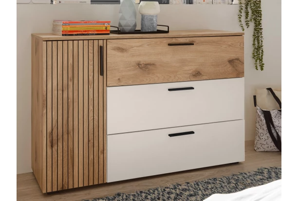 Komoda so zásuvkami z kolekcie Daria – krásny moderný nábytok v kombinácii dubového drevodekoru a bielych plôch dopĺňa zaujímavá optika lamiel, ktorá zaujme na pohľad a zároveň pôsobí veľmi útulne. Táto skrinka o celkovej šírke 125 cm ponúka kombináciu dverí i objemných zásuviek, možno tak využiť ako praktický bielizník v spálni alebo v akejkoľvek inej miestnosti bytu na univerzálne ukladanie vecí.