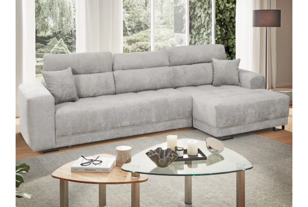 Táto rohová sedačka osloví príjemným komfortom, ktorý dopĺňajú chrbtové opierky s funkciou polohovania. Táto sedacia súprava s otomanom tvorí pravý roh a je očalúnená mäkkou žinilkovou látkou vo farbe svetlo šedá. Poťah kvalitne vypolstrovaného sedadla je doplnený okrasným prešivom. Tento variant sedačky obsahuje navyše elektrickú funkciu výsuvu, vďaka ktorej si môžete nastaviť hĺbku sedu podľa potreby – prispôsobíte si tak ľahko pohodlie na sedenie, na relaxáciu alebo prípadne na prespanie.